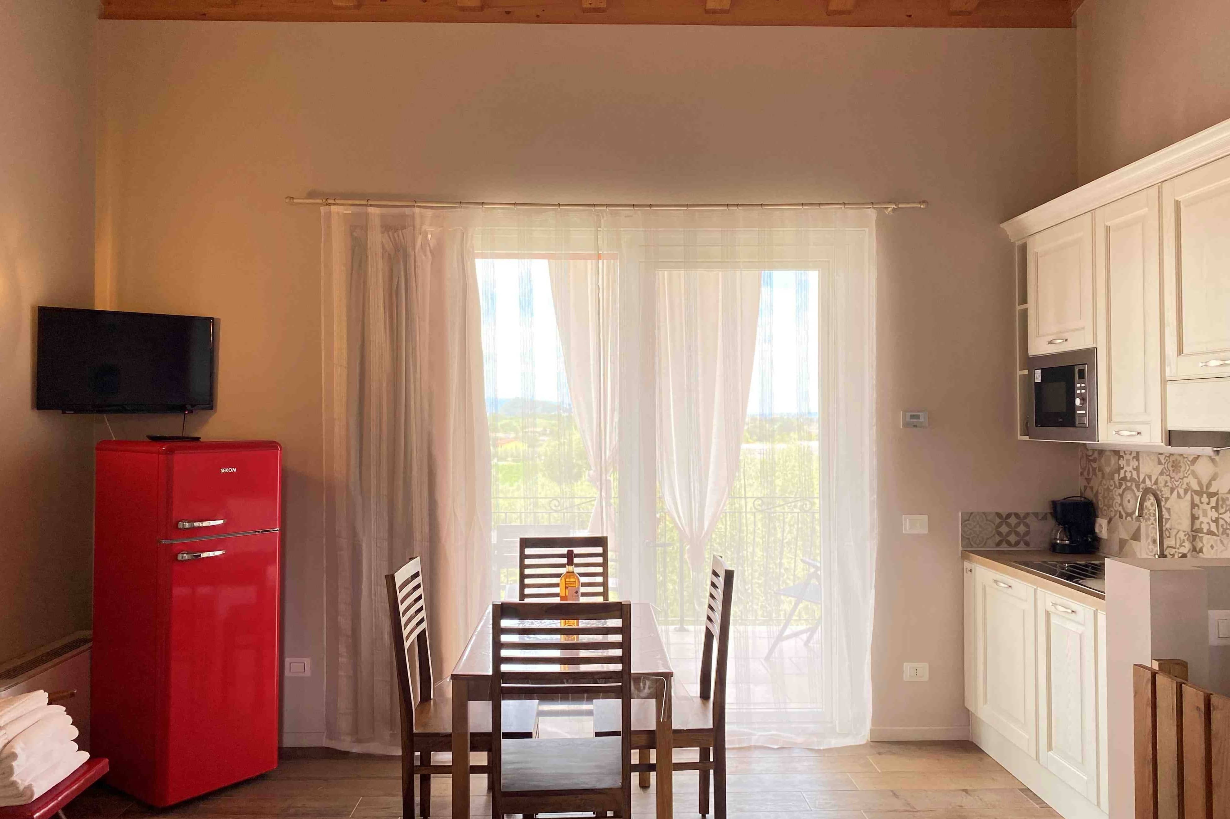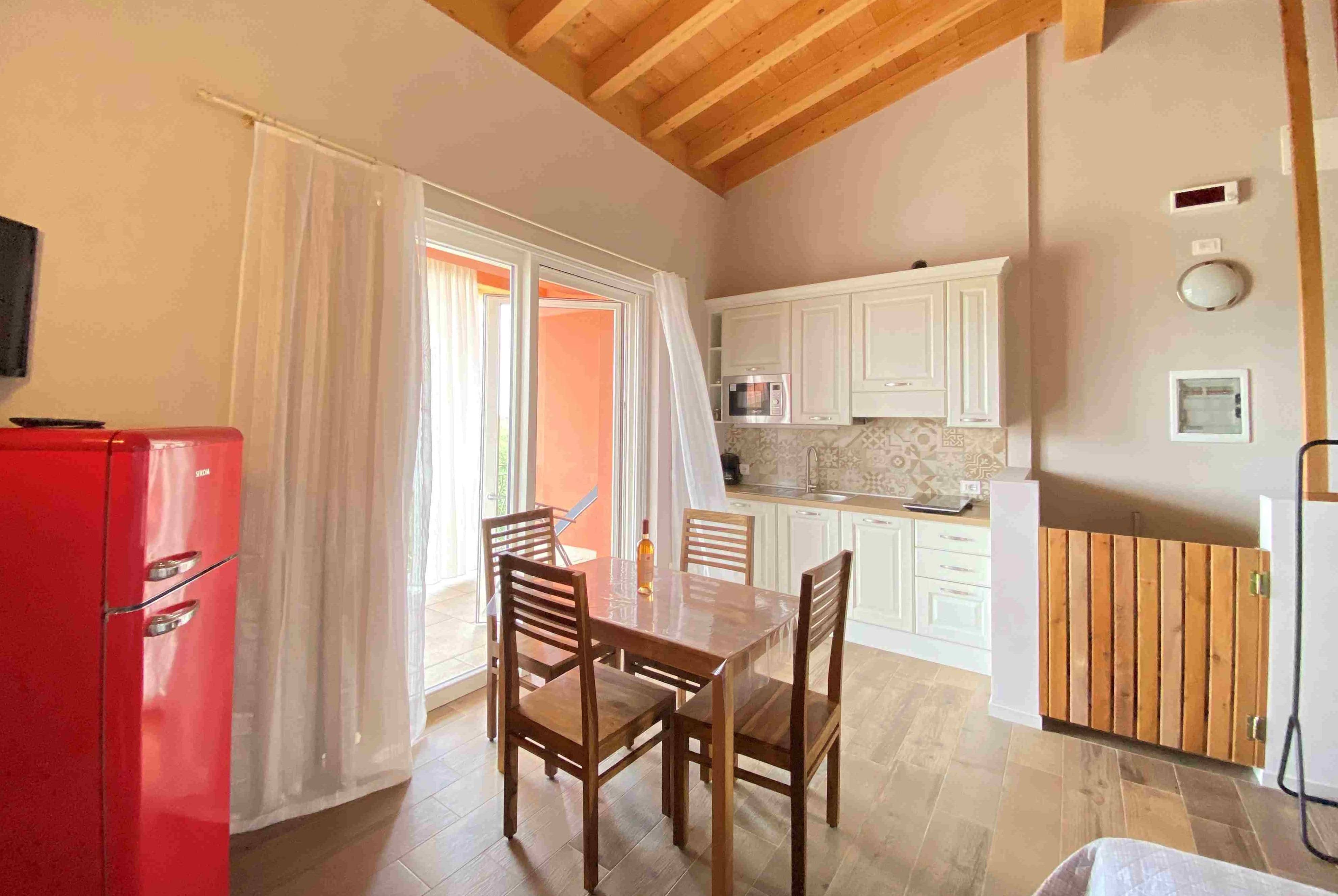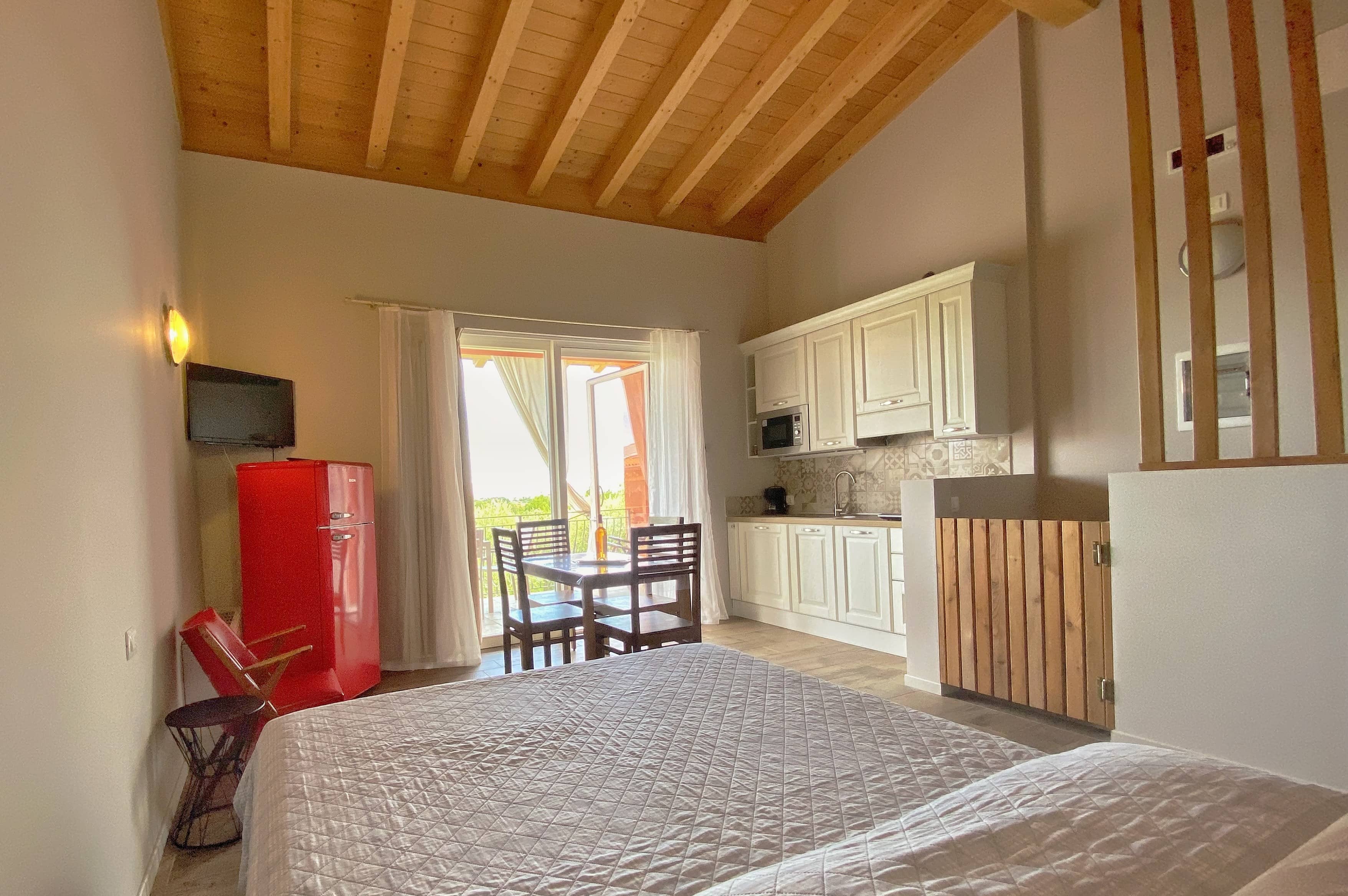 Appartamento monolocale situato al primo piano, caratterizzato dagli alti soffitti con travi di legno, letto matrimoniale e zona giorno con cucina, ampia terrazza e meravigliosa vista sul Monte Baldo.